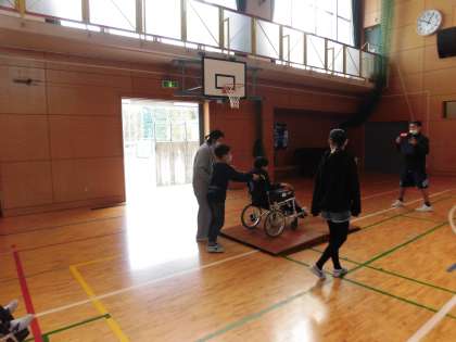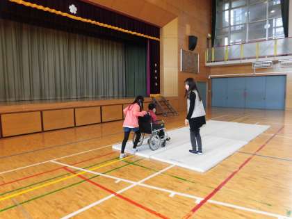 2・3校時に体育館で4年生が福祉の学習の一環として「車いす体験」を行いました。