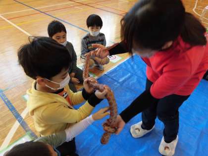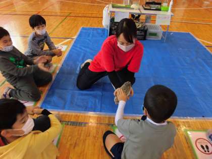 本日は学校に動物が来ました。1・2年生で様々な動物と触れ合うことができました。