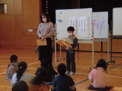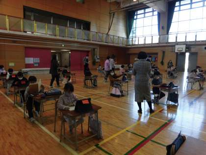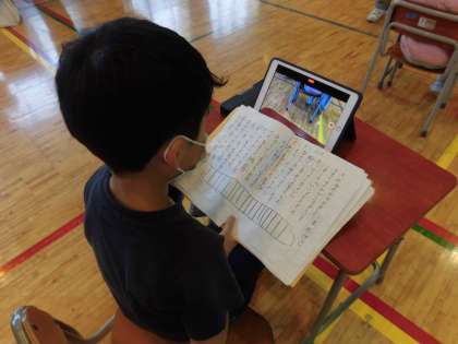 今年度、池尻小学校では「主体的・対話的で深い、学びができる児童の育成」を研究主題として、校内研究を進めています。今日は、1年1組で国語科の研究授業を行いました。通常は教室で行うところ、新型コロナ感染対策のために体育館へ移動し、先生方に囲まれての授業でしたが、担任の先生の指示をしっかりと聞き、タブレットを上手に扱いながら、意欲的に学習に取り組んでいました。