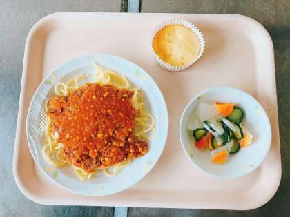 ミートスパゲッティ ピクルス パインケーキ 牛乳