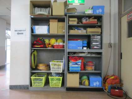 職員室前の体育道具を置く棚です。