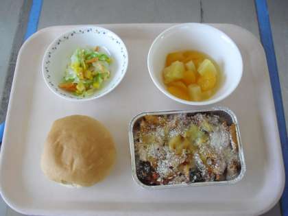 丸パン 牛乳 かぼちゃとペンネのグラタン コーンサラダ フルーツカクテル