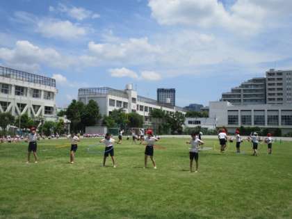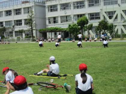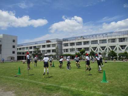 5年生6年生の演技は、「フラフープ」「創作ダンス」「竹馬・一輪車」「身体表現」「縄跳び」の5つのグループに分かれて、それぞれのグループで考えた表現です。