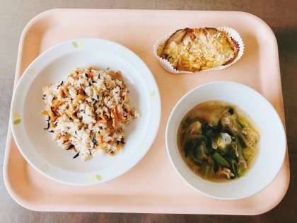 ひじきご飯 魚のマヨネーズ焼き 豚肉入りスープ 牛乳