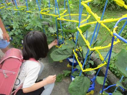今日も、「葉っぱがこんなに大きくなったよ。」「ナスの実ができたよ。」「トマトがたくさんなったんだよ。」と、たくさん報告してくれました。