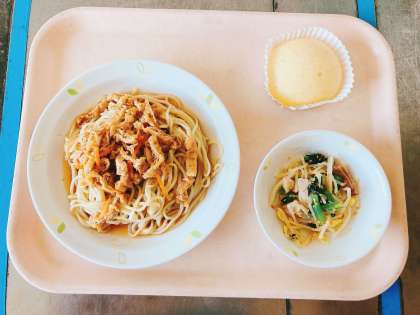 五目冷やしラーメン 豆もやしのあえ物 マーラーカオ 牛乳