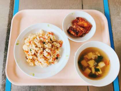 とりめし いかのカリント揚げ もずくスープ 牛乳
