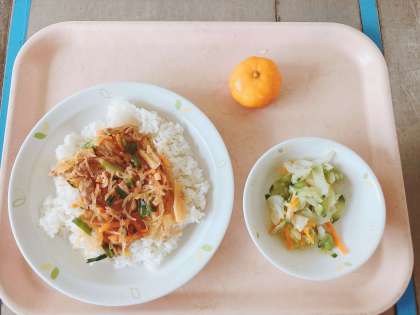 チャプチェ丼 枝豆入りフレンチサラダ 冷凍ミカン 牛乳