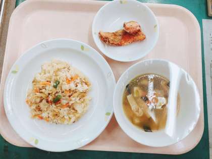 中華おこわ 魚のからあげ みそ汁 牛乳