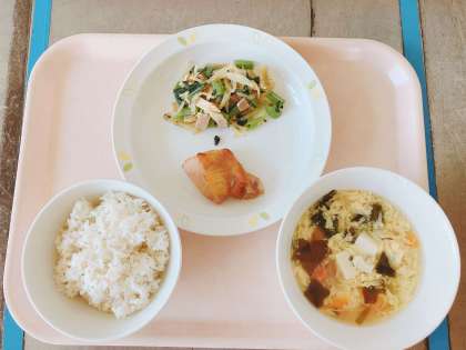 麦ごはん 鶏の麹焼き からしじょうゆかけ たまごとじスープ