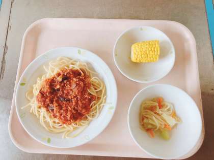 ナズミートスパゲッティ カレー風味サラダ とうもろこし 牛乳