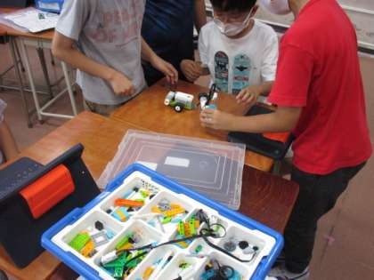 タブレットを見ながら、自分たちで作ったロボットに動きをプログラミングをしていました。
