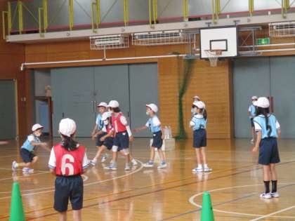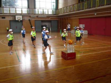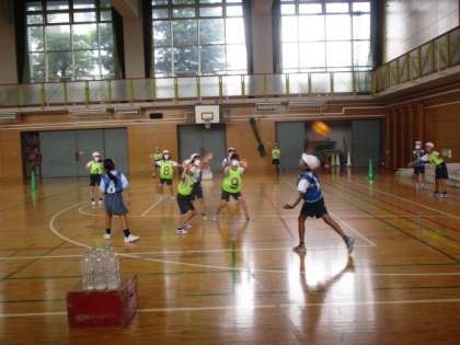 みんなで声を掛け合いながら、パスをつないで、ペットボトルをめがけて思い切りボールを投げていました。