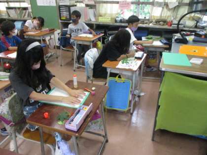 ビオトープギルドの方から植物についての話を聞いた後、子どもたちは、ビオトープから思い思いの植物を採取し、教室で観察をしました。