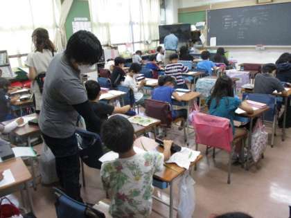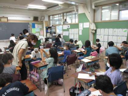 子どもたちは、顔を近づけ様子を観察し、カードにまとめていました。