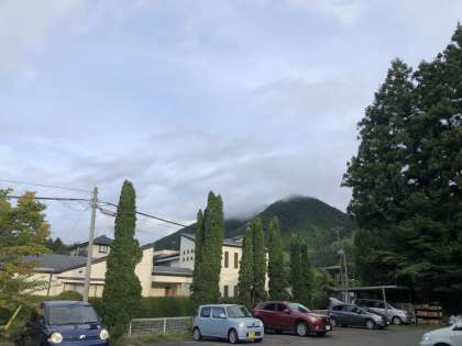 今朝の天気は、山の上に雲が出ていますが晴れです。