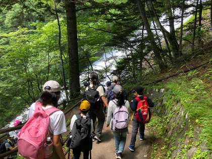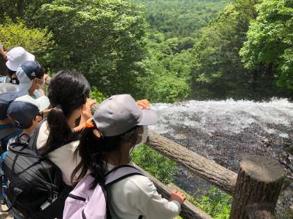 湯の湖畔を歩き、湯滝を通りました。まず、滝の上から様子の確認をしました。途中階段を降りながら、途中の流れも見ることができました。