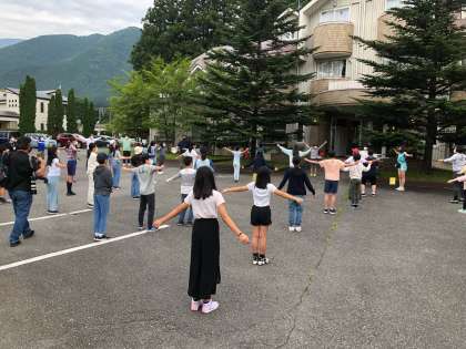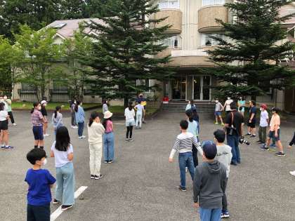 深呼吸で外の気持ちのよい空気を吸う人がたくさんいました。そして、朝の体操でリフレッシュです。