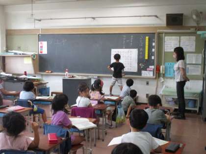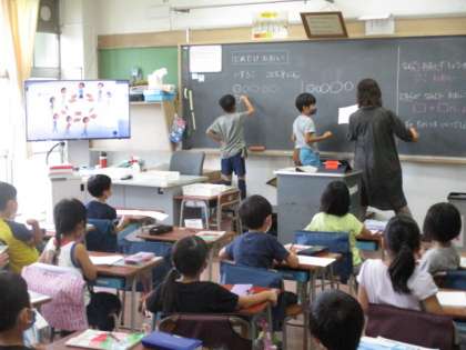 「ことばあそび」の学習です。表に並べてあるひらがなから言葉をつくっていきます。子どもたちは、楽しそうに言葉を並べていきました。