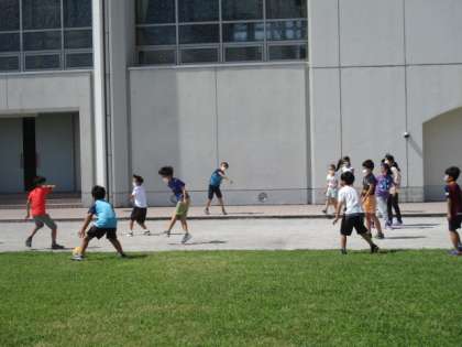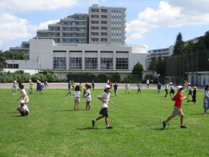 たくさんの子どもたちが校庭で遊んでいます。