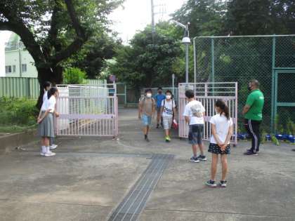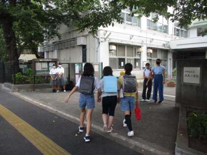今日も三宿中学校の生活委員会と池尻小学校の代表委員会の人によるあいさつ運動がありました。