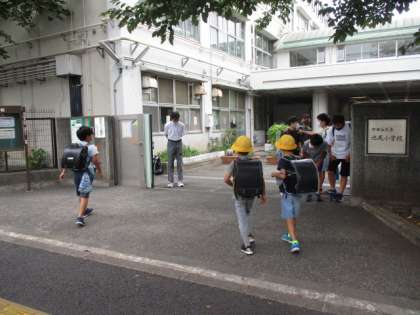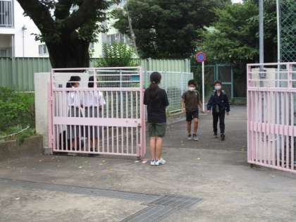 三宿中学校の生活委員会と池尻小学校の代表委員会の人が門に立ってあいさつをしています。