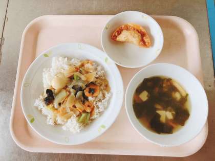 海鮮中華丼 わかめスープ 餃子の皮のアップルパイ 牛乳