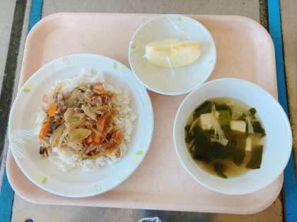 プルコギ丼 豆腐とわかめのスープ りんご 牛乳