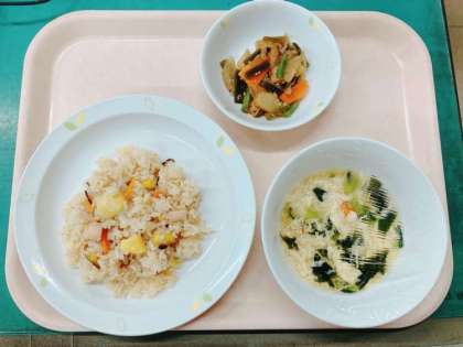 秋の香りごはん くきわかめのきんぴら かきたま汁 牛乳