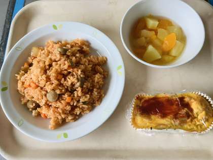 ジャンバラヤ スペイン風オムレツ フルーツポンチ 牛乳