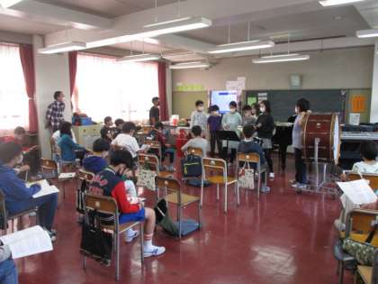 1組の授業は音楽です。「アフリカンシンフォニー」を班ごとに合奏します。リズムが大切な曲です。互いのリズムを意識しながら、演奏していました。