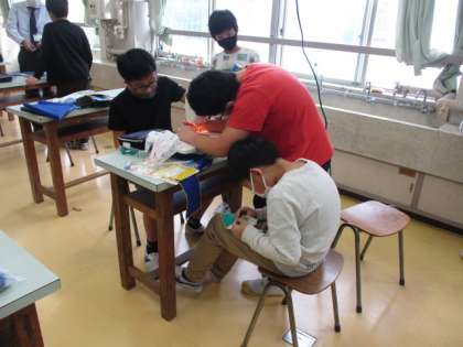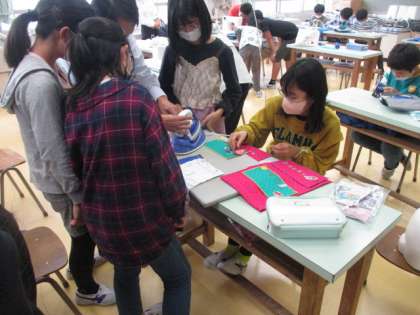 2組の授業は家庭科です。ウォールポケットを作ります。ミシンで縫ったり手縫いをしたりするとともに、アイロンプリントや刺しゅうで飾りつけをしていきます。個性豊かな作品が出来上がっていきます。