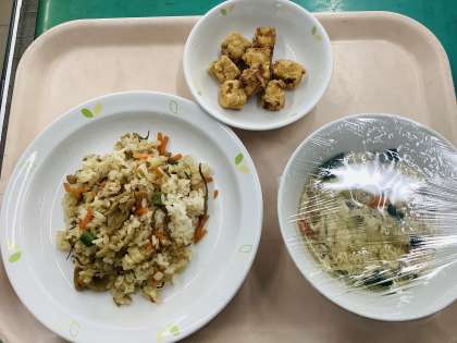 豚肉と牛蒡のご飯 高野豆腐のからあげ にらたまスープ
