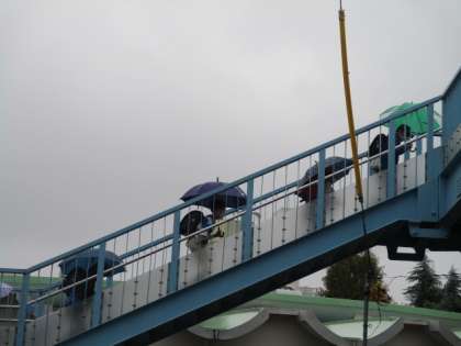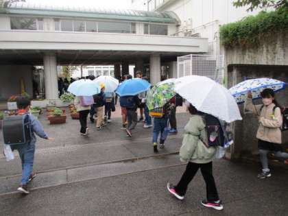 子どもたちの登校です。はじめは、かさをささなくても大丈夫なくらいだったのですが、だんだん強くなり、かさがないとかなり濡れてしまうような雨になっていました。