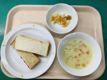 二色サンド クラムチャウダー 白菜サラダ 牛乳