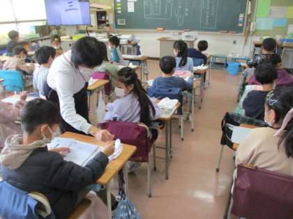 2組の授業は日本語です。「えんぴつ」と「ふで」の書き具合の違いを感じ取る授業です。