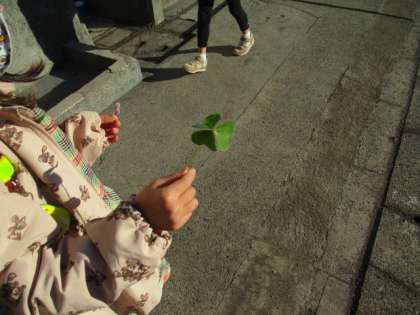 1年生からおおきな三つ葉のクローバーをもらいました。登校してくる人に見せると、その大きさにびっくりしていました。