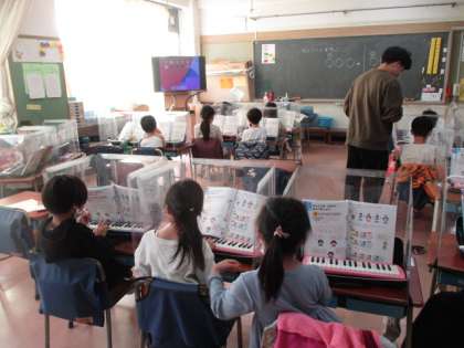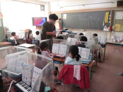 鍵盤ハーモニカの授業です。友達と、3つの音をつなげて旋律を作ります。子どもたちは、できあがった旋律を聞いて、笑顔を見せていました。