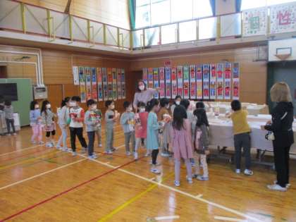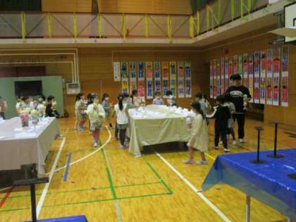 展覧会に出展する立体作品を1年生が搬入に来ました。今までと雰囲気の違う体育館にびっくりしています。子どもたちが持っている立体作品は、「おいしいパフェをつくろう」です。