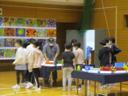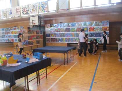 6年生の搬入です。立体作品は、「サンドイッチボックス」「ランプシェード」です。6年生の作品は、体育館フロアと舞台そでに分かれています。舞台そでにも忘れずにお入りください。