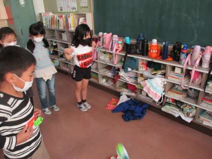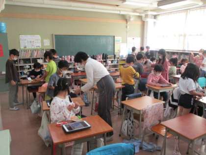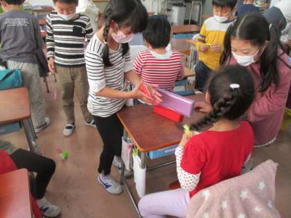 2組の授業は生活です。牛乳パックでつくった「パッチンカエル」を使っての遊び方を工夫しています。