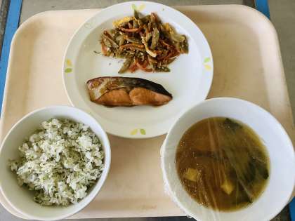 じゃこと青のりのご飯 照り焼き きんぴら みそ汁 牛乳
