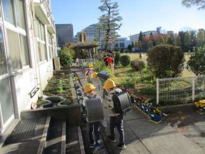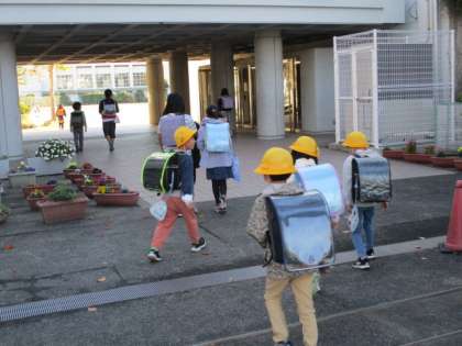 子どもたちが登校してきました。今日も気持ちのよい青空です。空は雲がなく青一色です。