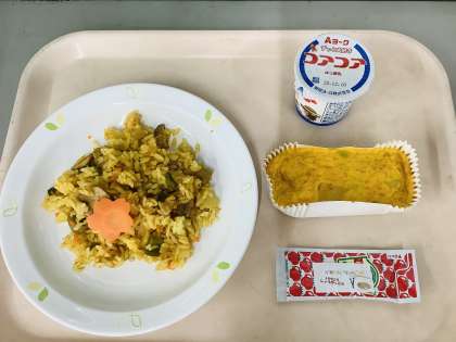 カレーピラフ 卵焼き ヨーグルト オレンジジュース