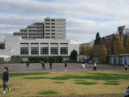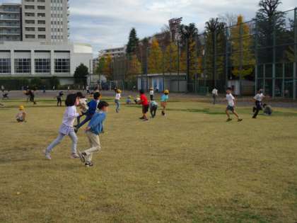 中休みになりました。子どもたちが校庭に出てきました。広い校庭に散ってみんなが遊んでいます。