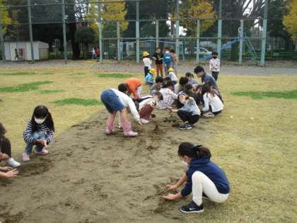 28日(月)にはがされたしまった芝生のあとには、砂がまいてあります。その場所では、砂団子などを作り、砂遊びをしている人たちもいました。子どもたちはいろいろな遊びを考えますね。