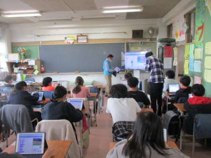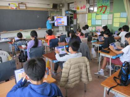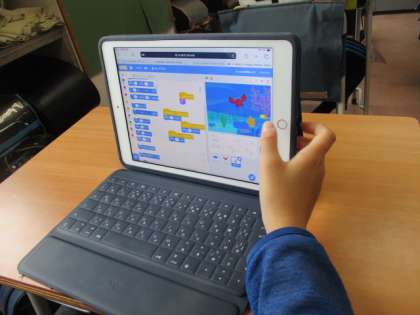 ICT支援員の先生から説明を受け、一人ひとり自分のタブレットを操作していきます。画面上のキャラクターにどのように指示を出すのか、みんな夢中になってタブレットを見つめていました。