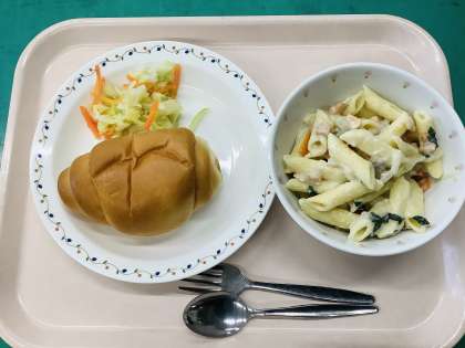 ロールパン 鮭のクリームペンネ キャベツサラダ 牛乳
