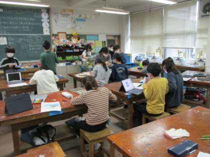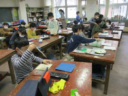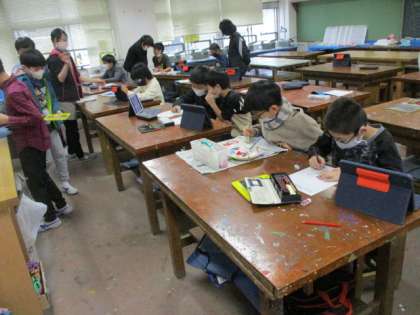 板を電ノコで切り取り、パズルを作ります。今日はそのデザインの作成から始まりました。早い人は、デザインを板に写し、色を塗り始めました。