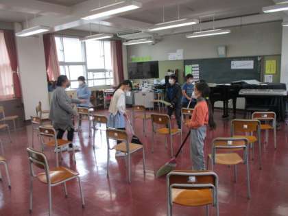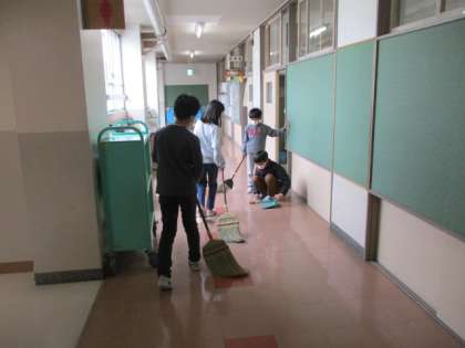 掃除の時間です。それぞれ分担場所に移動して掃除をしています。
